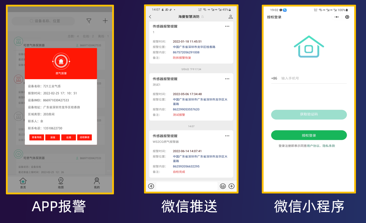 設(shè)備監(jiān)測(cè)到氣體泄露后,會(huì)同時(shí)通過平臺(tái)彈窗、平臺(tái)警報(bào)聲、電話、短信、APP報(bào)警、微信推送方式通知用戶,而且電話可以同時(shí)分享給多人,把報(bào)警信息通知給安全負(fù)責(zé)人以及用戶端。